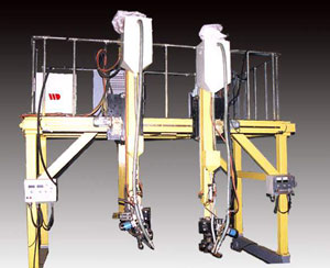 产品特点: 1、同时完成两件H型钢的船形位置焊接,提高效率。也可同时完成H型钢(或箱形梁等工件)两道角焊缝的焊接,有效减小焊接变形。 2、行走电机采用进口变频器调速,台车行走平衡,无爬行。 3、机械式焊缝传器装置自动完成对焊缝的动态传器,保证焊接质量。 4、负压式回收系统对焊剂进行自动回收、送进,提高焊剂利用率,节约材料。 5、可增加单弧双丝或双弧双丝焊接功能,有效提高焊接效率。