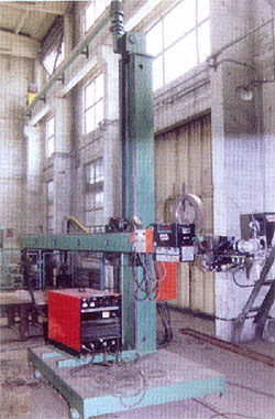 由立柱、横梁、地车及电控部分组成,横梁沿立柱上下等速运动,水平方向无级调速运动(直流可控硅系统);立柱可±360°回转,完成任意工位焊接。装于横梁端部的电动十字滑板带动机头进行水平、垂直方向等速调节(±80mm)。可焊最小内径φ450mm,最大外径φ10000mm。